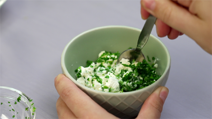 Schneide den Blätterteig genau so ein wie vorher, vermische den Frischkäse mit den Kräutern, belege die Vierecke und falte dann den Teig zu Windrädern.