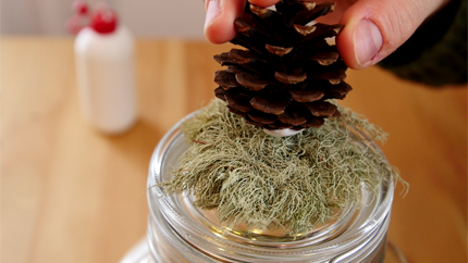 Das Glas könnt ihr außen verzieren und zum Beispiel eine Flechte und einen Tannenzapfen auf den Deckel kleben.