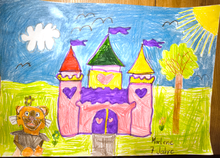 Marlene F. (7 Jahre) aus Oberösterreich hat eine bunte Burg gezeichnet. Der Burgherr Kurt sitzt draußen und genießt das schöne Wetter.