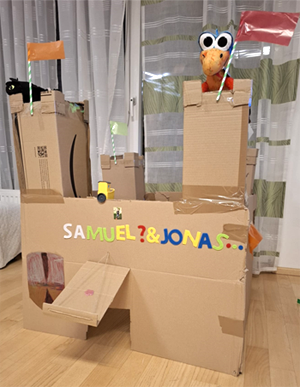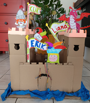 Jonas R. aus der Steiermark hat eine Burg für sich und seinen Bruder Samuel aus alten Kartons gebaut. Auf dem Burgturm wachen zwei Drachen.