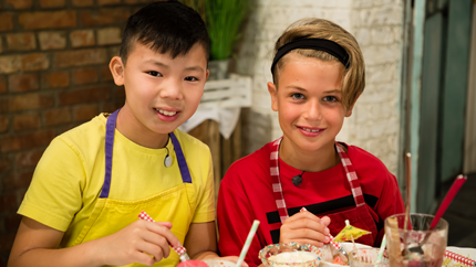 Team Gelb bekommt eine süße Aufgabe. Felix und Kyra dürfen Eisbecher mit einer salzigen Karamellsauce zubereiten. Die beiden füllen ihre Eisbecher mit Vanille- und Schokoladeneis, frischen Beeren, Bananen, Eiswaffeln und Marshmallows.